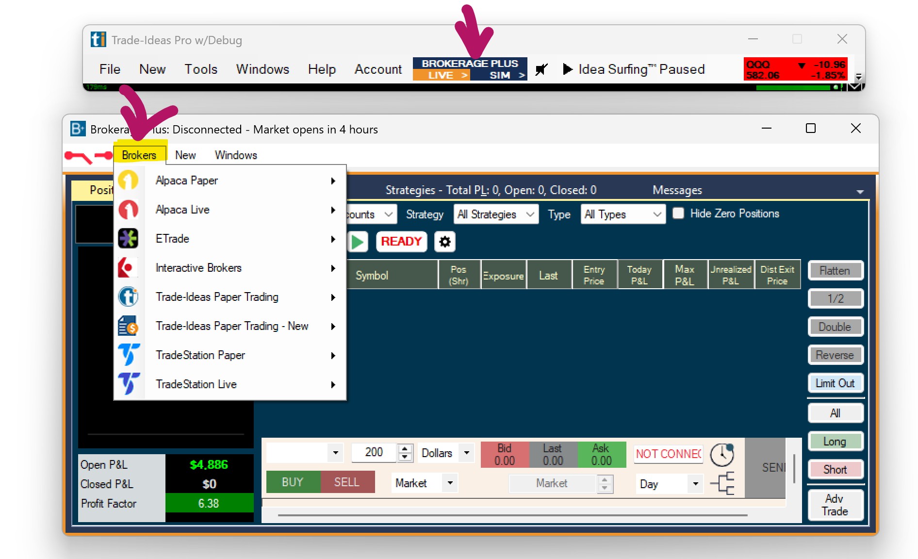 The Brokers Tab enables you to connect our Brokerage Plus Module to our in-house simulator or to an account at participating brokerages, for example IB, ETrade, Alpaca or TradeStation.